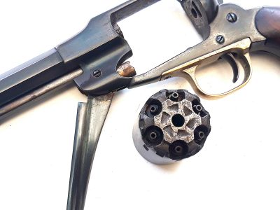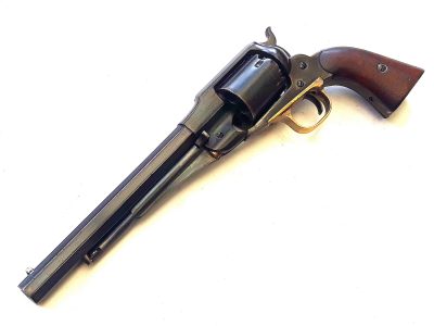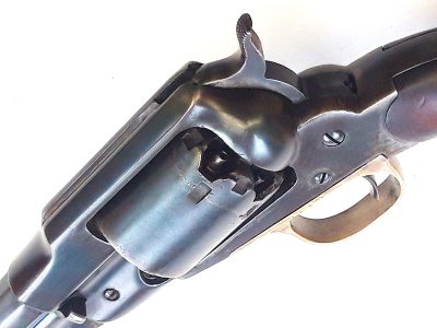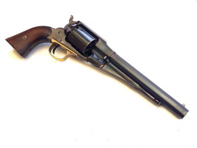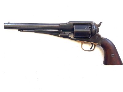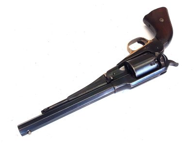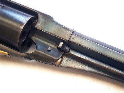 A very nice, sharp Remington 1858 Army caliber 44. It has excellent, deep, sharp rifling. It has excellent timing and a tight action. It still has plenty of blue, fading to a dark brown in places. It’s a matching number, including the cylinder. There’s no play in the cylinder. A very nice and sharp Remington 1858 Army.